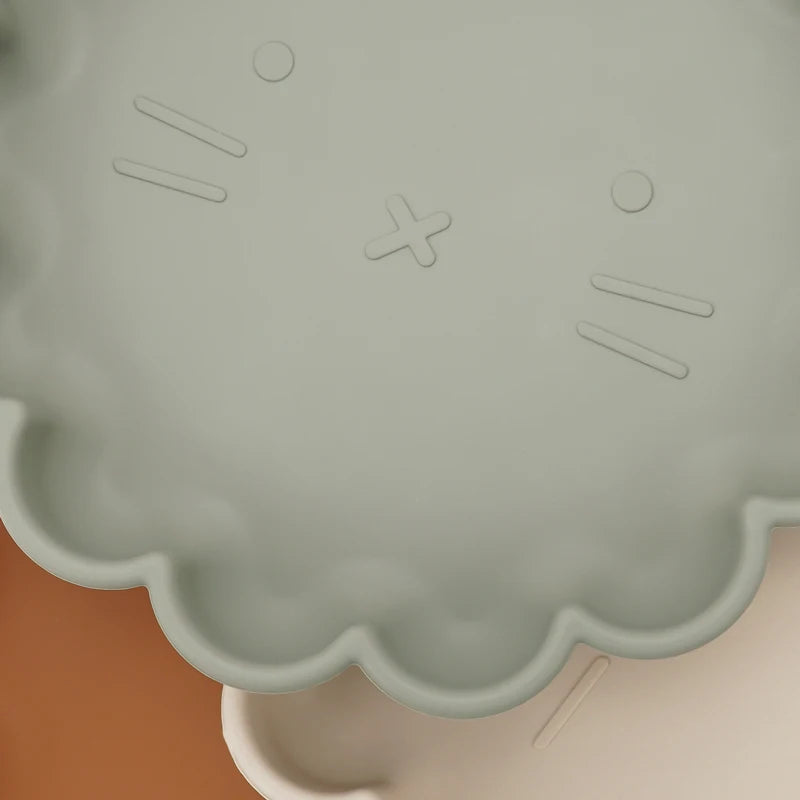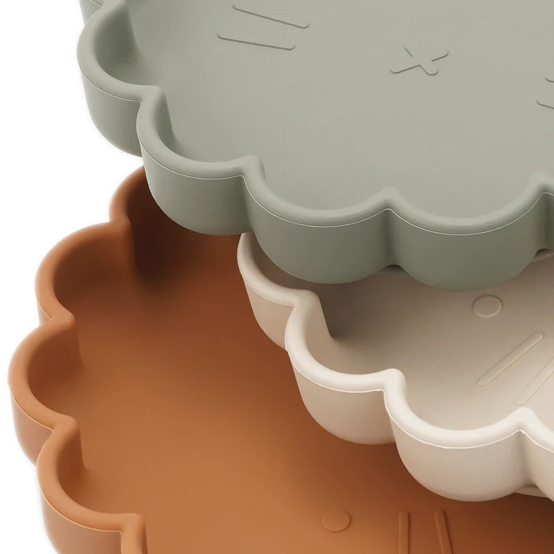 3-piece silicone baby feeding set including plate, spoon, and fork.