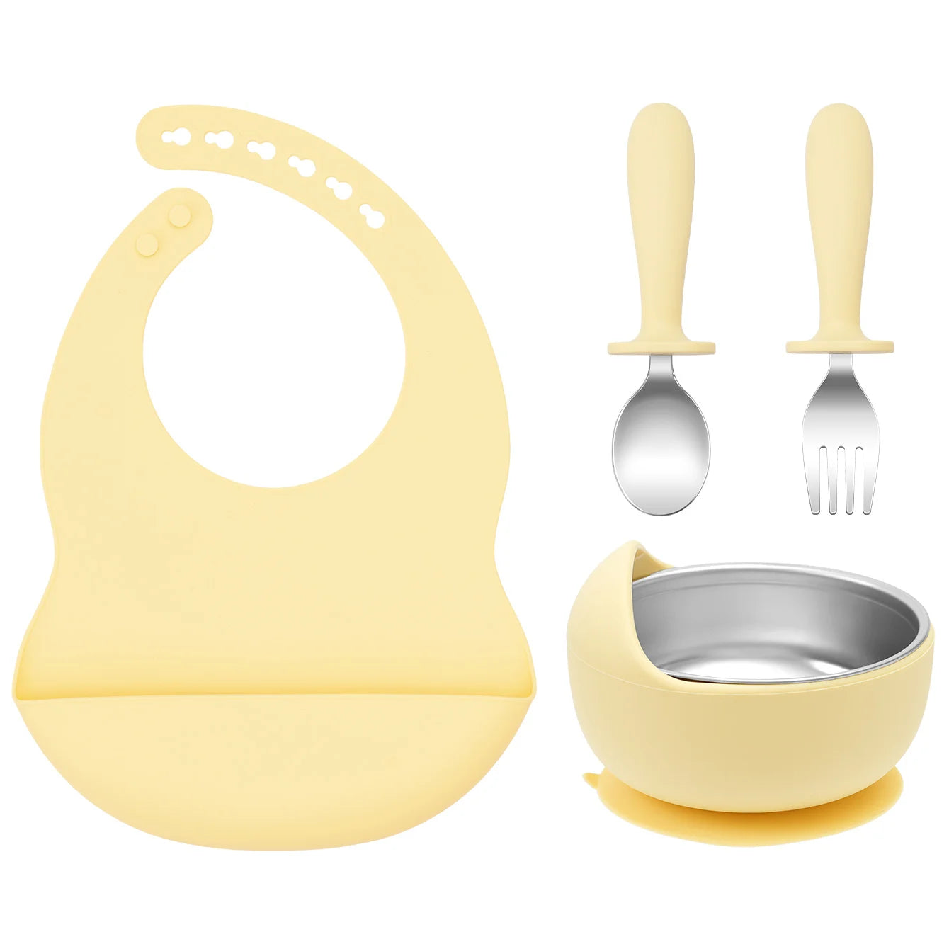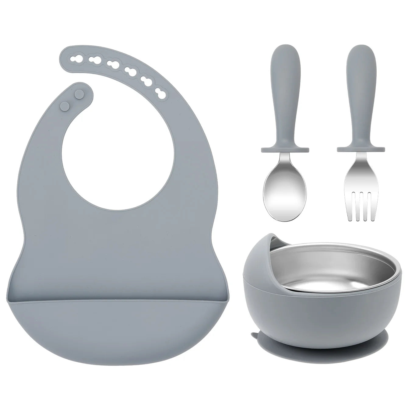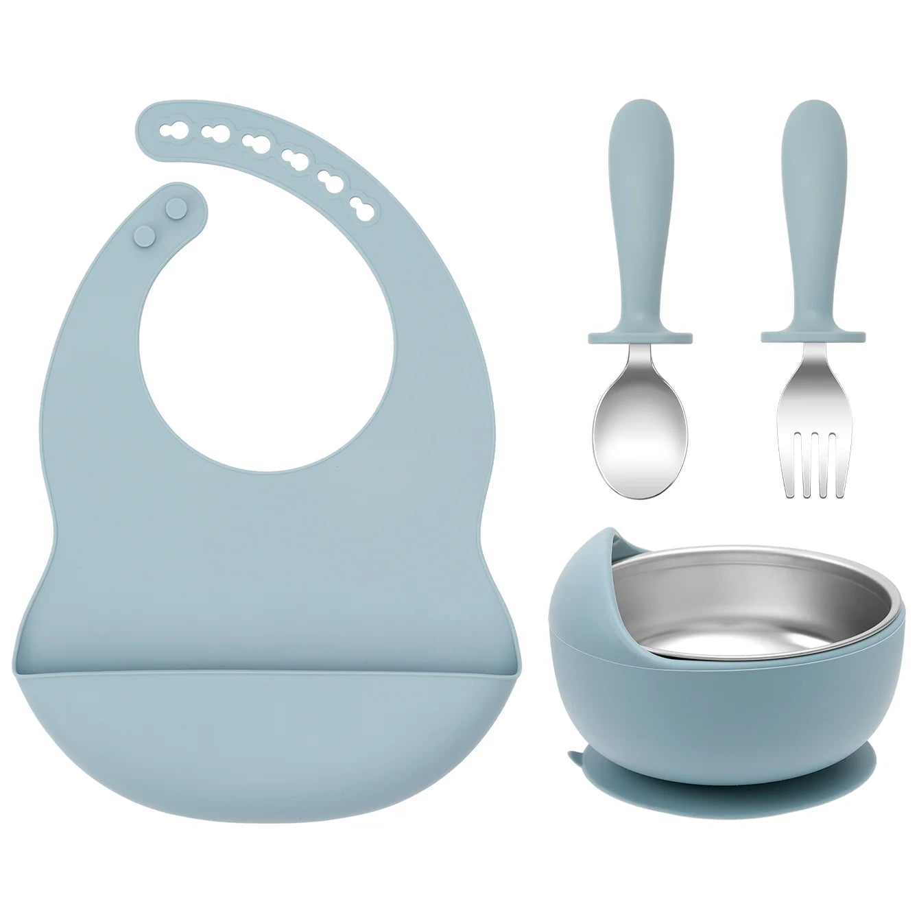 This 4-piece baby feeding set includes a stainless steel bowl, fork, and spoon with a silicone suction base.