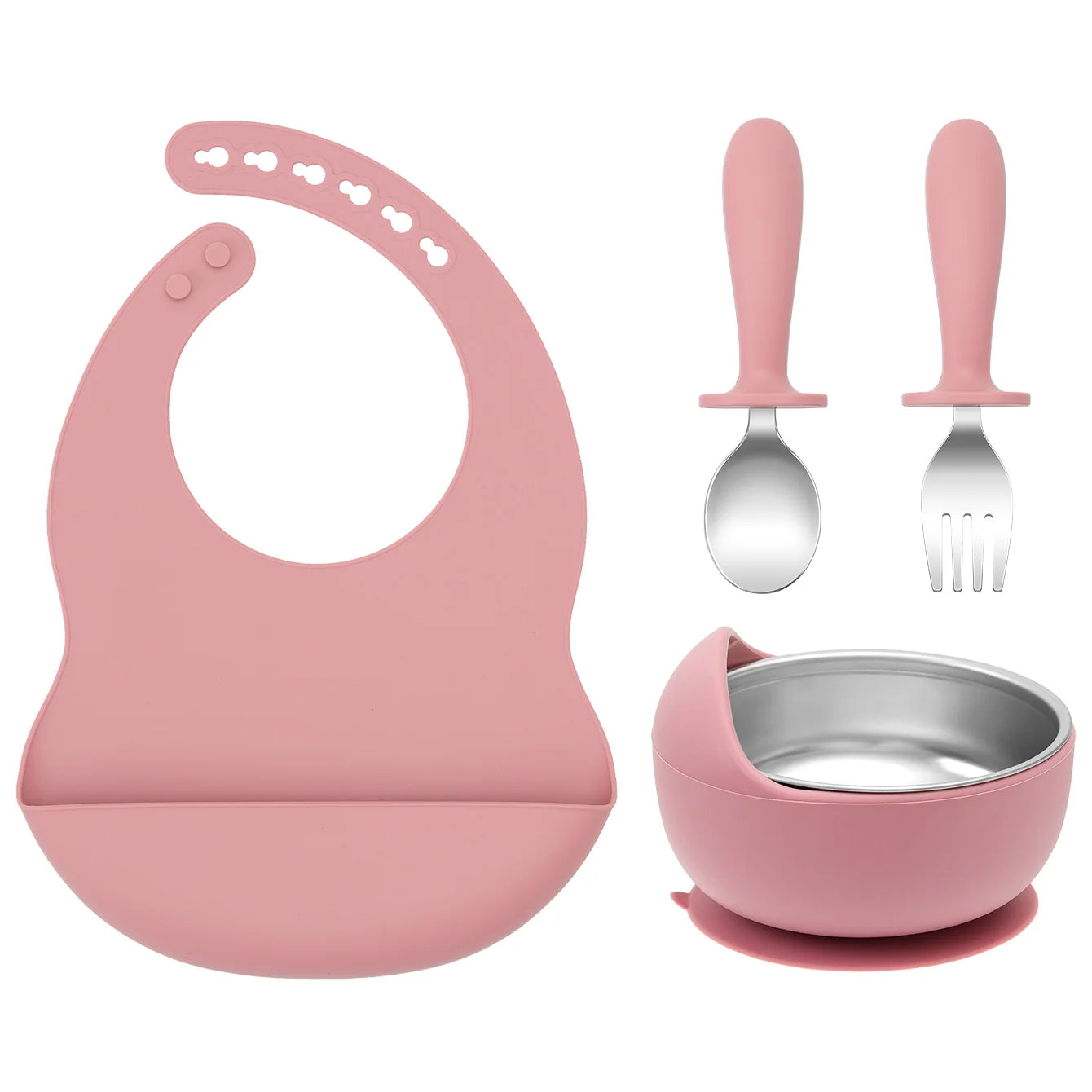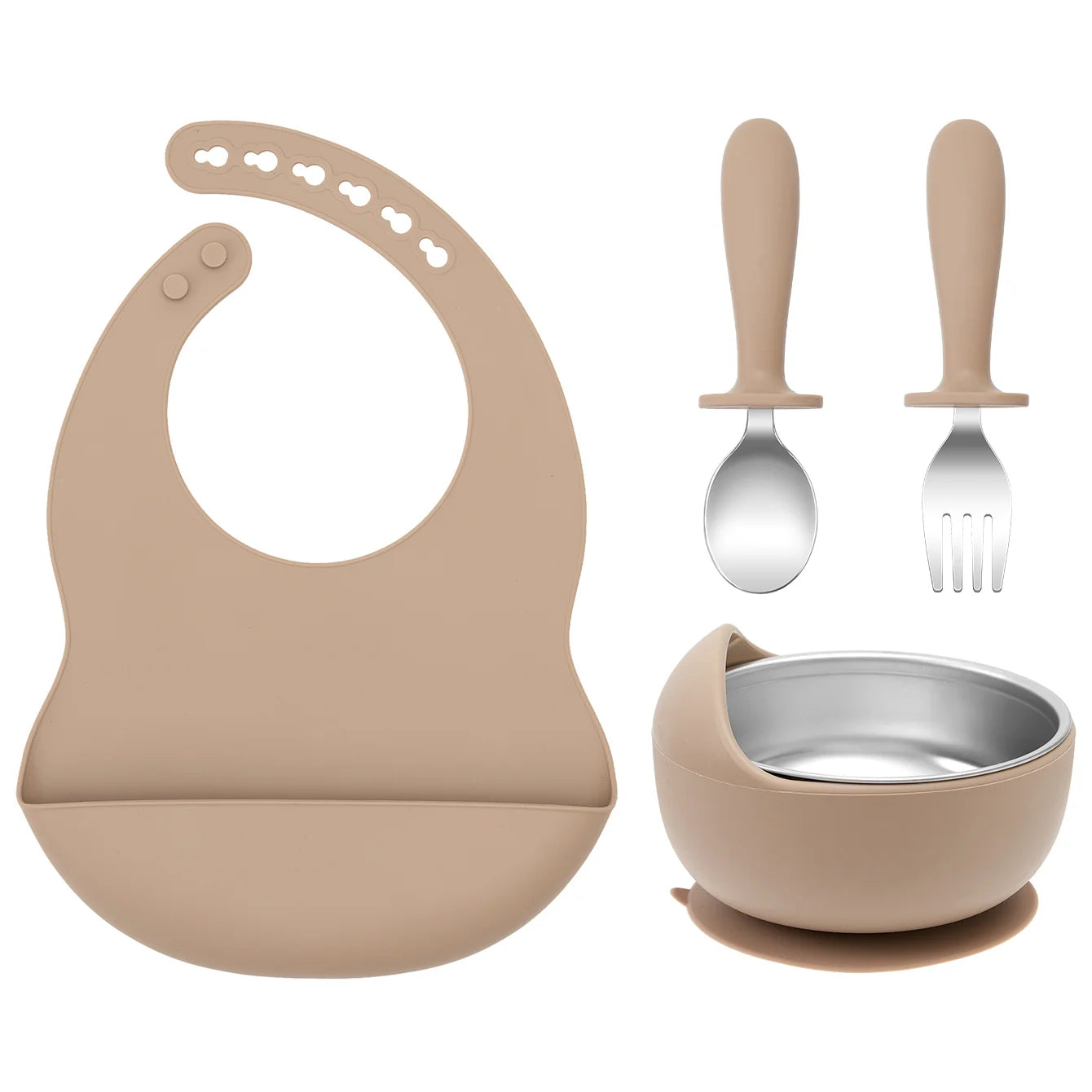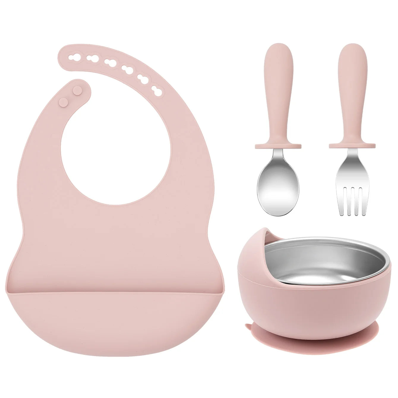 This 4-piece baby feeding set includes a stainless steel bowl, fork, and spoon with a silicone suction base.