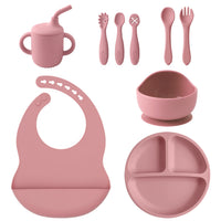 This 9-piece baby feeding set includes suction plates, a bowl, bib, and sippy cup, all made from BPA-free silicone.