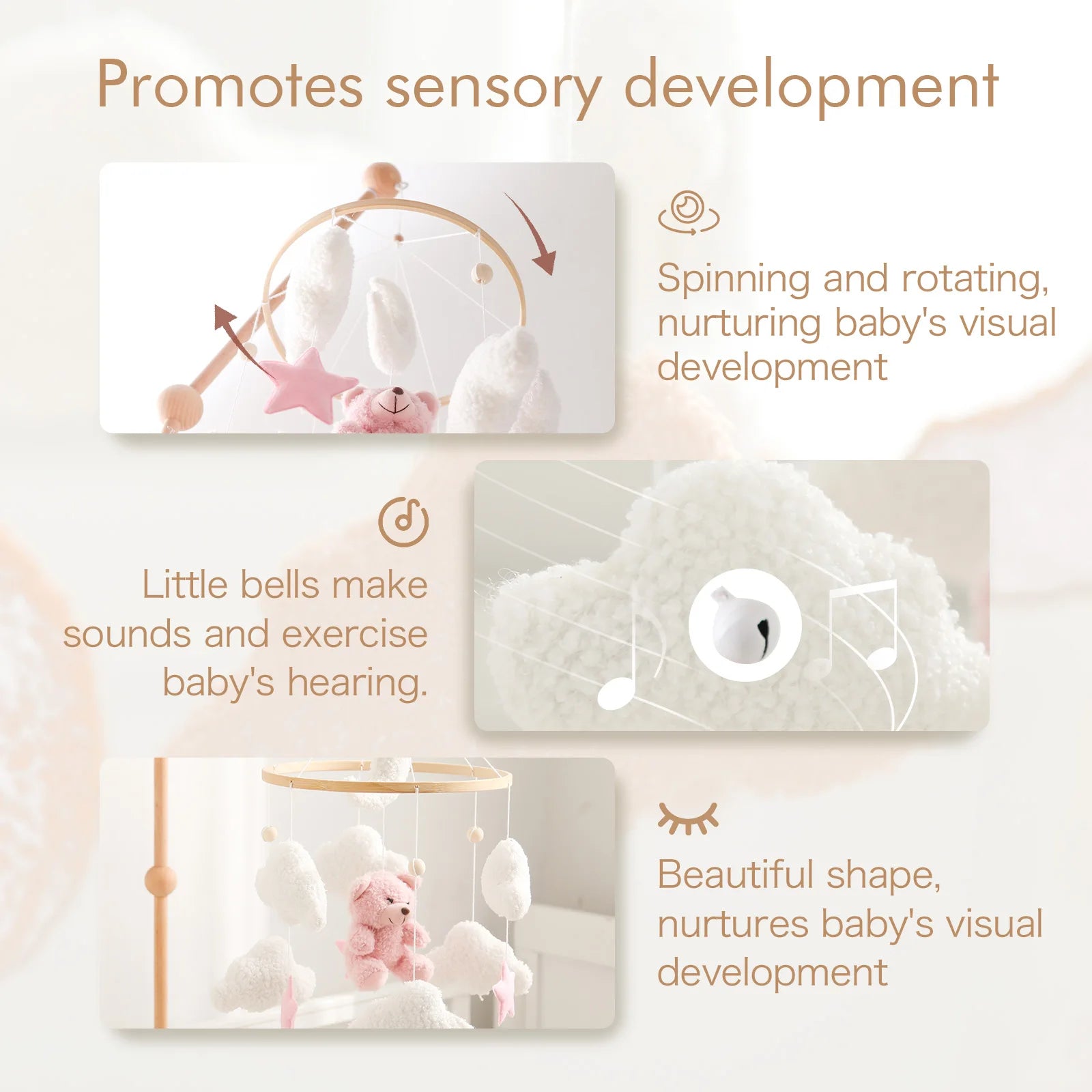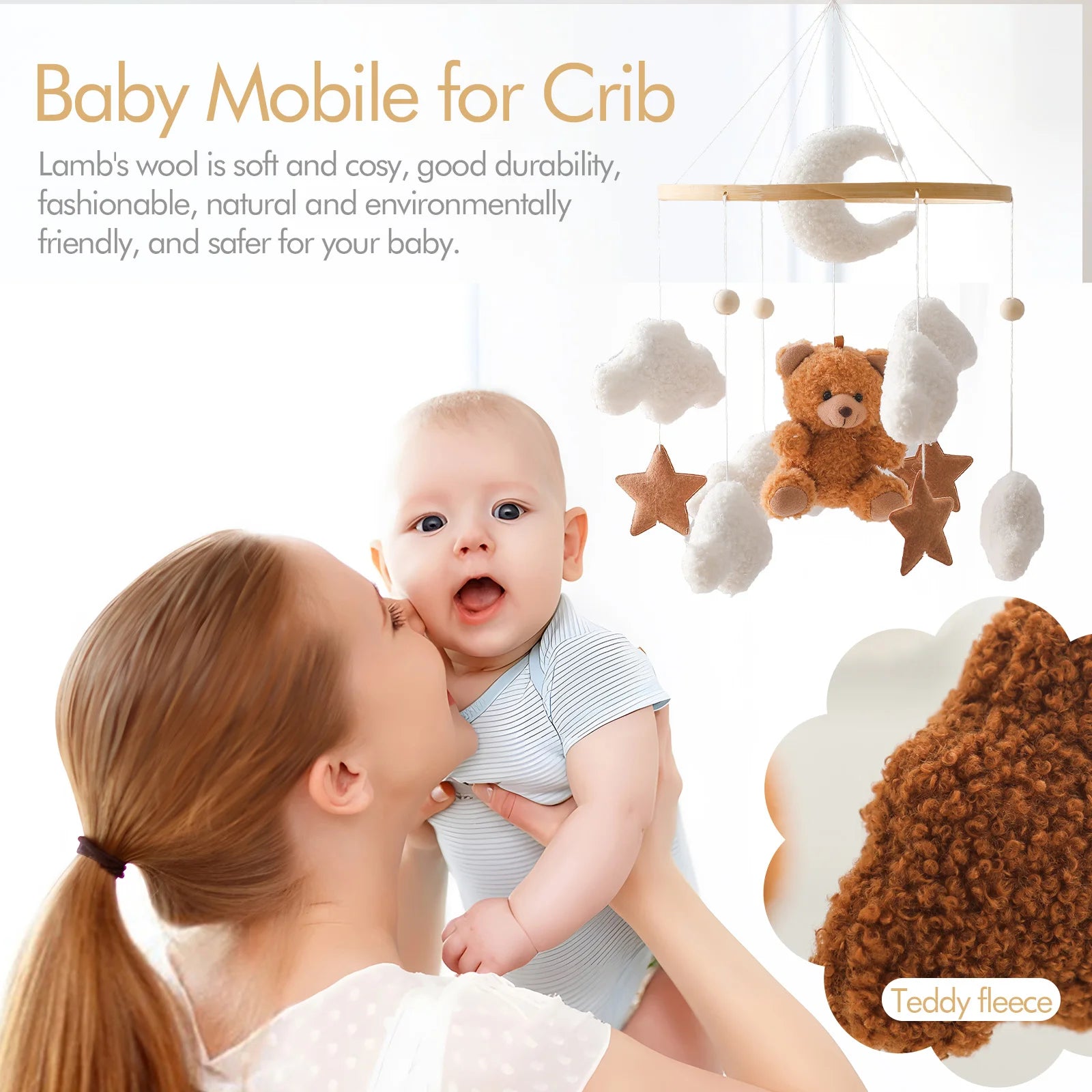 Soft and charming teddy bear crib mobile made with safe wooden and velvet materials.
