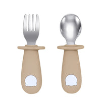 Baby feeding spoon and fork set with BPA-free silicone handles, ideal for toddlers aged 0–6 years.