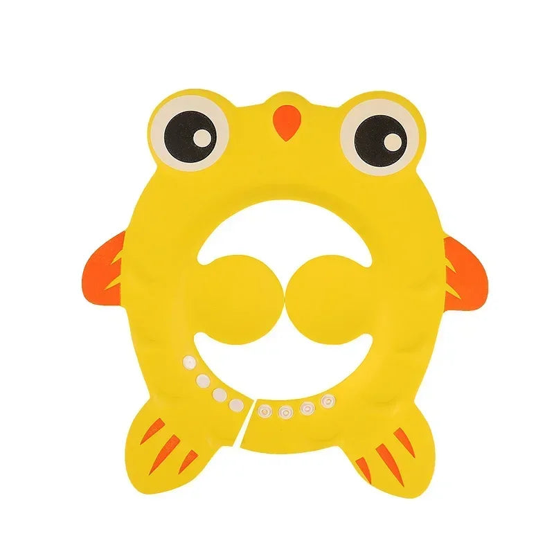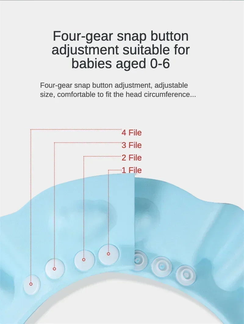Adjustable, waterproof baby shower hat protects eyes and face from shampoo and bath water.