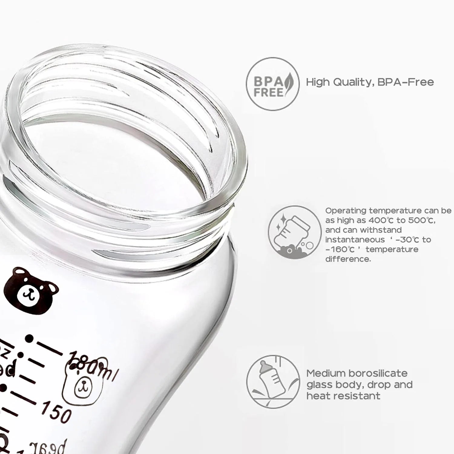 Baby Glass Bottle with Bear Cup Cover – 180ml Capacity, Wide Mouth, Cartoon Design