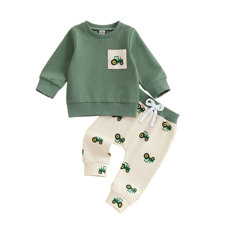 Adorable 2-piece toddler set featuring a tractor-print sweatshirt and matching pants.