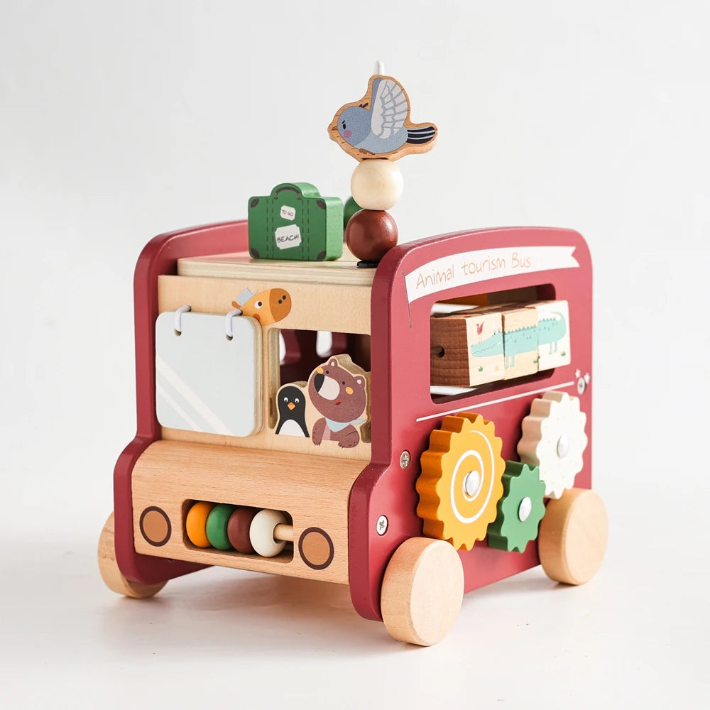 Multifunctional 5-in-1 wooden activity toy combining blocks, puzzles, and a bus design.