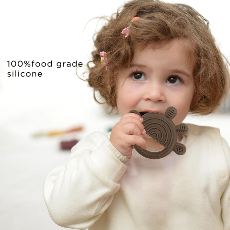Soft BPA-free silicone teether in cute cartoon shapes for babies.