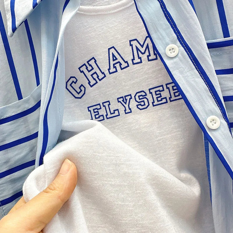 Trendy 3-piece summer set featuring a striped button-up shirt, printed tank top, and denim shorts.