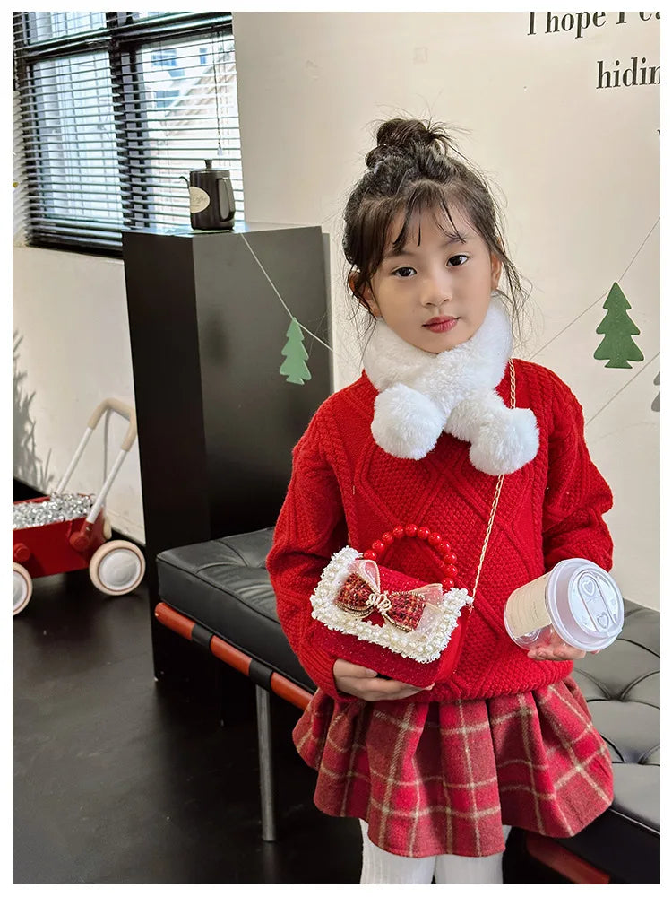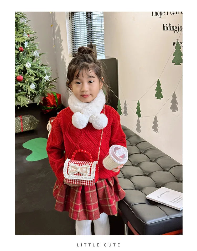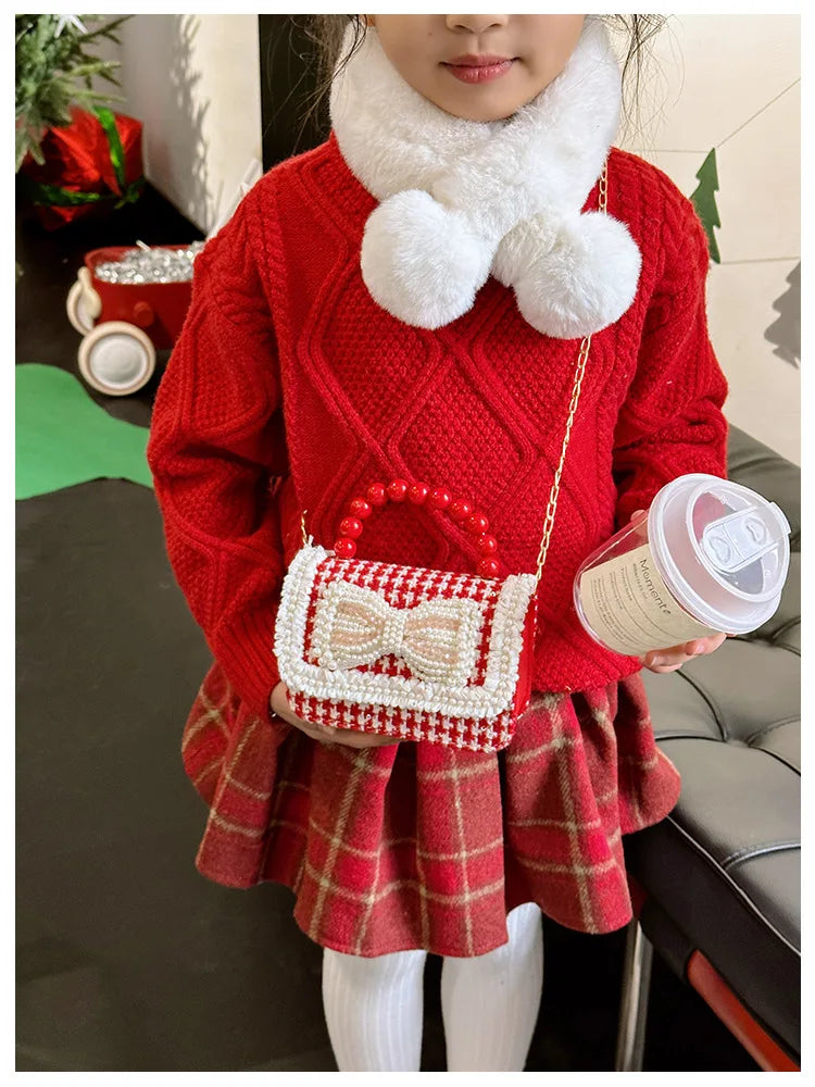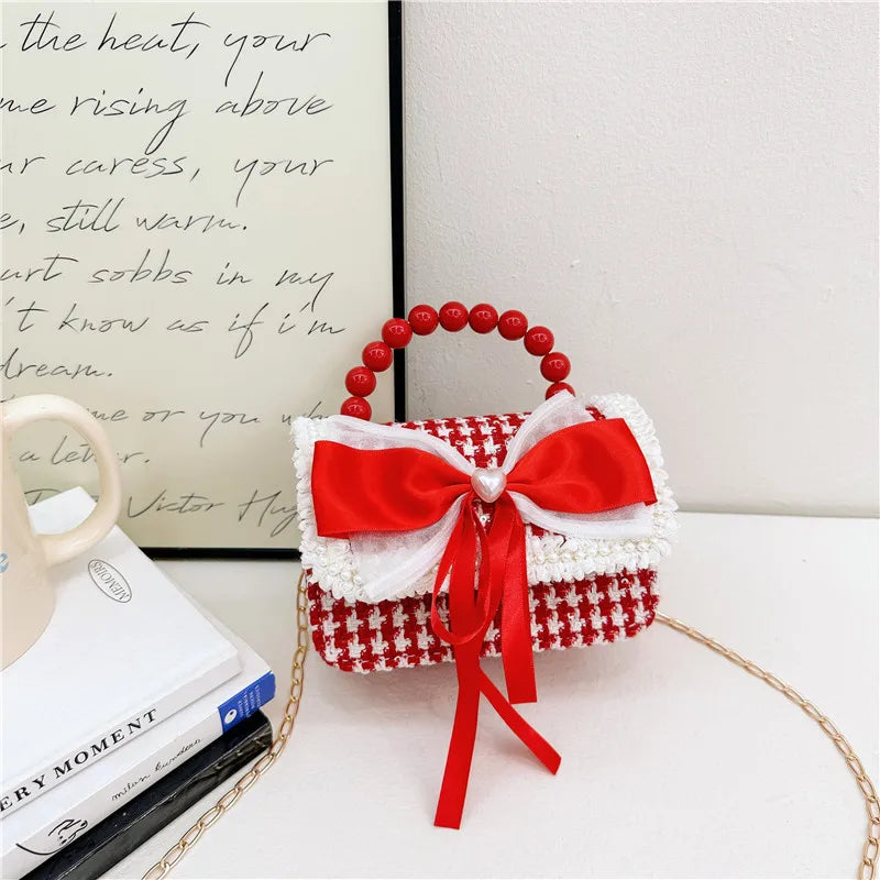 Decorated with bow, lace, and pearl accents for a fashionable look.