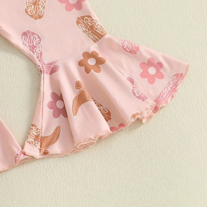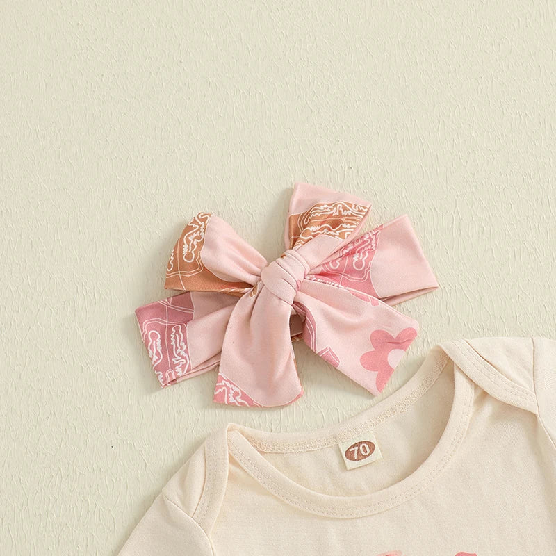 Adorable 3-piece summer set with short-sleeve romper, floral flare pants, and matching bow headband.