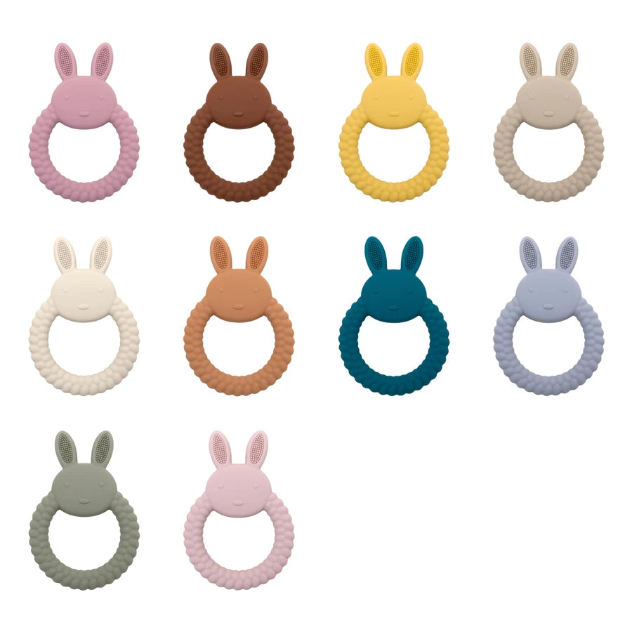 Cartoon rabbit-shaped silicone teether designed for babies and toddlers aged 0–6 years.