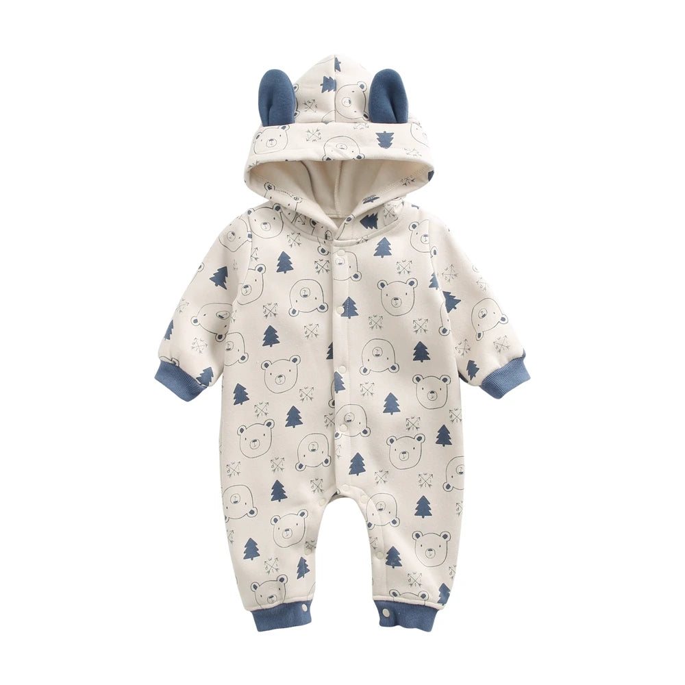 Keep your little one warm and cozy this winter with this adorable hooded romper. Made from soft, breathable 100% cotton, it’s gentle on delicate baby skin and perfect for everyday wear. The full-sleeve design and hood provide extra warmth, while the cute cartoon pattern adds a playful, stylish touch. Ideal for infants and toddlers during winter outings or at home.