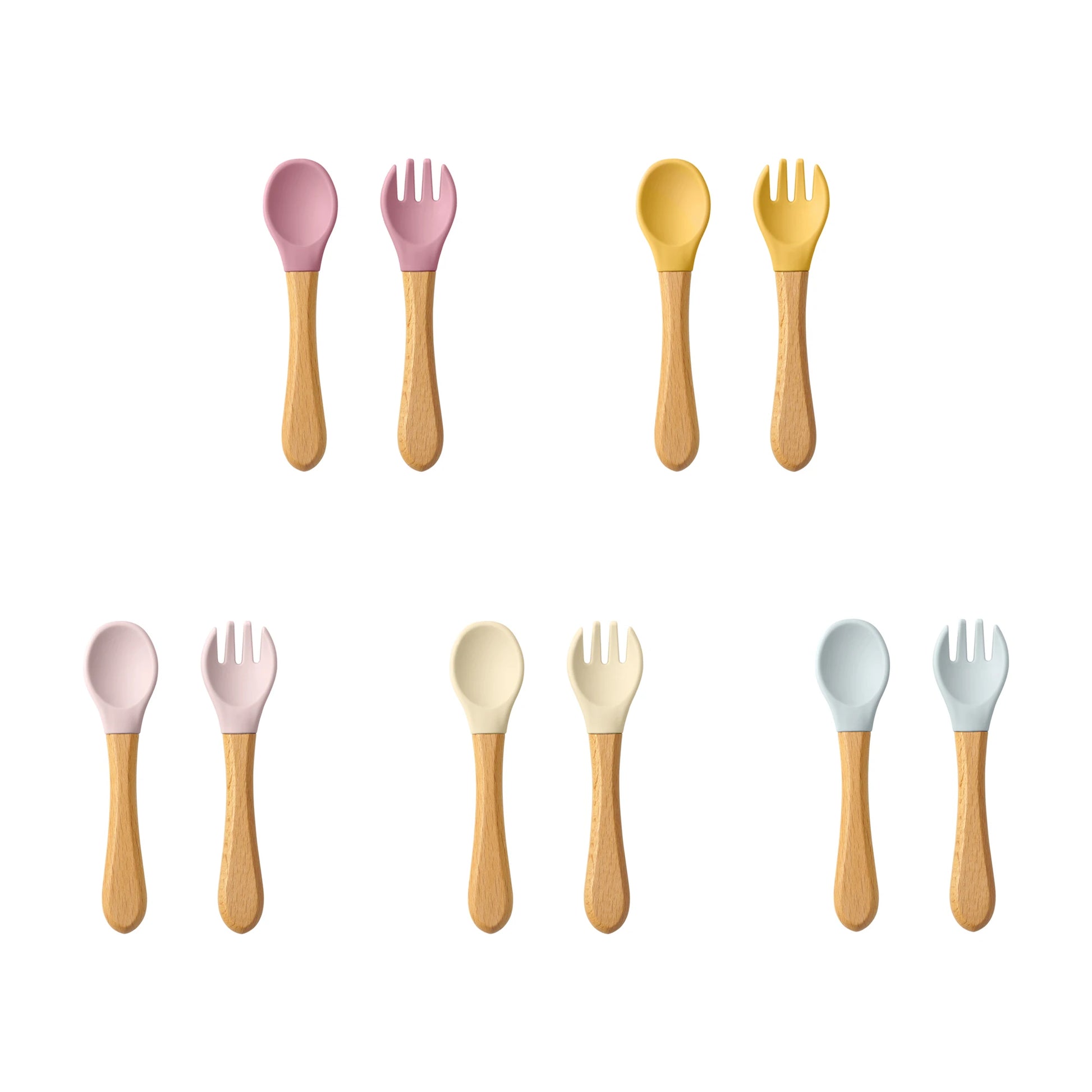 This 2-piece baby utensil set includes a spoon and fork with silicone handles and wooden accents.